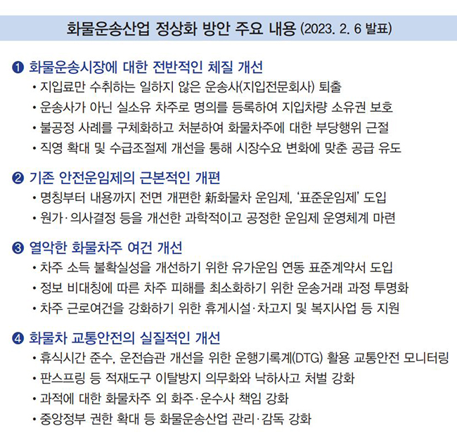 이 방안의 세부내용은 크게 ▲영업용 화물차 진입규제 완화 ▲업종개편 ▲화물차 안전운임제 도입이다.