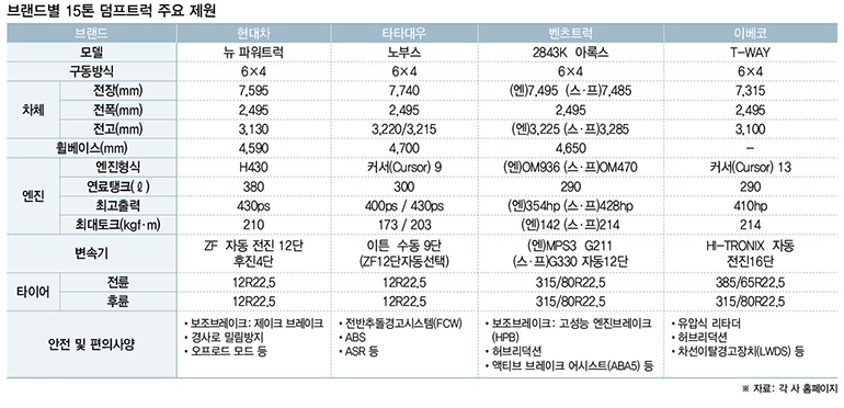 정부의 조기 폐차 및 대차 정책 시행과 함께 15톤 덤프트럭을 판매하고 있는 브랜드가 현대자동차, 타타대우상용차, 이베코 3개 사에서 올해 메르세데스-벤츠트럭까지 4개 사로 늘어나며 제품군이 확장됨에 따라, 브랜드별 판매 경쟁이 치열해지고 있다.