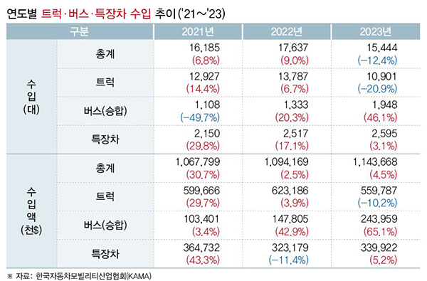 트럭·버스·특장차 수입 1만 5,444대, 전년比 12.4%↓