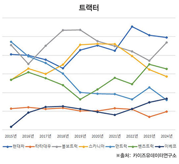 트랙터 부문에서는 수입 브랜드의 압도적인 강세가 지속되고 있다. 올해 7월까지의 점유율을 보면 국산과 수입산의 비율이 30대 70으로, 수입 브랜드들이 시장을 장악하고 있다. 특히 이 부문에서 현대차를 비롯한 국산 브랜드들의 고전이 두드러진다.