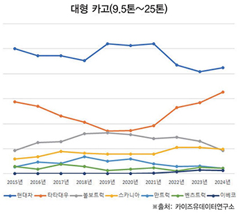 대형 카고 시장에서는 국산 브랜드의 강세가 더욱 두드러진다. 1월부터 7월까지 현대차가 42.5%의 점유율을 기록하며 1위를 차지했다. 이는 2019년 52.1%에서 9.6%p 하락한 수치지만, 여전히 시장을 주도하고 있음을 보여준다. 현대차는 안정적인 성능과 높은 신뢰도, 그리고 국내 도로 환경과 운송 조건에 최적화된 제품 개발로 시장 방어에 주력하고 있다.