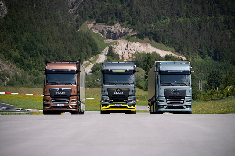 MAN eTGX와 MAN eTGS 대형 트럭은 최대 6개의 배터리를 모듈식으로 결합할 수 있으며, 333, 449, 544마력 등의 선택지를 제공한다. 최상위 트림 eTGX 6x2 모델에는 섀시에 7번째 고전압 배터리 장착이 가능하여 최대 623kWh(560kW)의 용량으로 재충전 없이 약 650km를 주행할 수 있다.