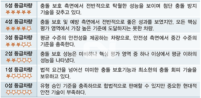 유럽 NCAP에서는 별의 등급은 법적 요구 사항을 넘어서며 모든 신차가 NCAP 테스트를 거쳐야 하는 것은 아니라고 밝히고 있다. 그러므로 최소한의 법적 요구 사항만 충족하는 자동차는 별을 받을 자격이 없고, 그렇다고 테스트를 통해 낮은 등급을 받은 자동차가 반드시 안전하지 않다는 것도 아니라고 설명했다. 다만 더 높은 등급을 받은 경쟁 차량만큼 안전하지는 않다는 것을 의미한다고 명시하고 있다.