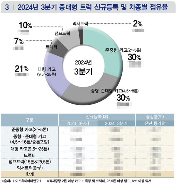[통계] 2024년 3분기 중대형 트럭 신규등록 및 차종별 점유율 ※ 상세한 통계와 그래프는 상용차매거진 128호(11월호)에서 확인하실 수 있습니다 저작권자 © 상용차신문 무단전재 및 재배포 금지 키워드 Tags #통계 #중대형트럭 #신규등록 #점유율 정하용 기자 jung.hy@cvinfo.com 다른기사 보기 SNS 기사보내기 페이스북(으)로 기사보내기 트위터(으)로 기사보내기 카카오스토리(으)로 기사보내기 URL복사(으)로 기사보내기 이메일(으)로 기사보내기 다른 공유 찾기 기사스크랩하기 당신만 안 본 뉴스 타타대우-삼척시, 수소엔진 실증 생태계 구축 위한 MOU 체결 벤츠트럭 'e악트로스 600', 충돌 시험서 차량 안전성 입증 기아 4조 원 투자, PBV 전용 'EVO Plant' 화성에 조성...연 25만 대 생산 목표 친환경 상용차 연료비, 내연기관 추월하나? 현대차그룹 수소 브랜드 HTWO, 중국 광저우에 수소버스 공급 만트럭버스코리아, '바디빌더 세미나 2025'로 특장 업계 협력 강화 기아, 평택에 PBV 특화 거점 'PBV 익스피리언스 센터' 개소 타타대우-삼척시, 수소엔진 실증 생태계 구축 위한 MOU 체결 댓글삭제 삭제한 댓글은 다시 복구할 수 없습니다. 그래도 삭제하시겠습니까? 비밀번호 닫기 기사 댓글 0 댓글 접기 로그인 후 이용 가능합니다. 댓글 내용입력 비회원 로그인 이름 비밀번호 댓글 내용입력 댓글쓰기 계정을 선택하시면 로그인·계정인증을 통해 댓글을 남기실 수 있습니다. 회원 로그인 비회원 글쓰기 이름 비밀번호 자동등록방지 로그인 옵션 창닫기 주요기사 만트럭버스코리아, 탱크로리·BCC 전용 '뉴 MAN TGX 4800' 출시 서울시 보유 경유청소차 2,800대 중 절반이 1~5톤급 한성특장, 특장업계 최초 ‘트럭·특장 전손보험’ 첫 적용...3천만원 재구매 지원 만트럭버스코리아, '바디빌더 세미나 2025'로 특장 업계 협력 강화 공신력 데이터 기반 ‘중고 트럭과 특장차 시세’ 제공한다 10월 트럭 시장, 전년 동월 대비 25.5% 감소