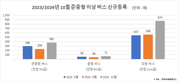카이즈유데이터연구소 통계에 따르면, 지난달 준중형급 이상 버스 시장 판매(신차 신규등록 기준)가 전년 동기 대비 47.0% 증가했다. 이에 올 1월부터 10월까지의 버스 판매 실적은 총 9,100대로 8,107대를 팔았던 전년 동기보다 12.2% 오른 것으로 집계됐다.