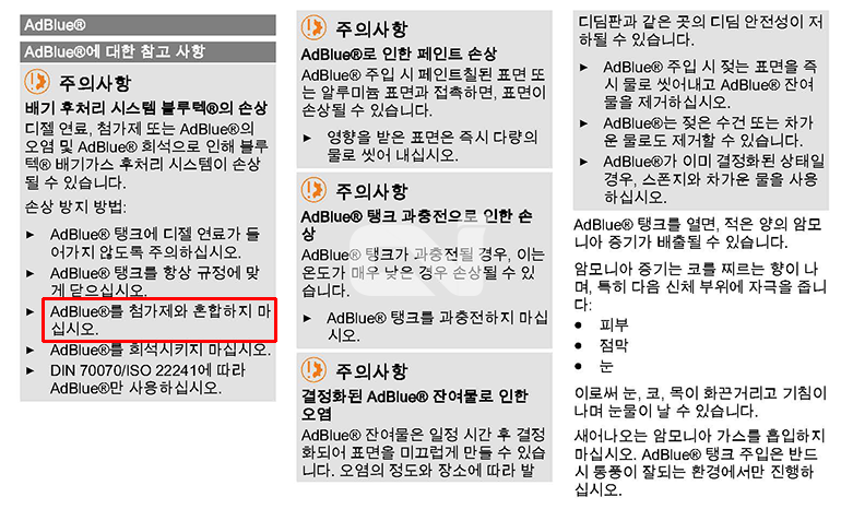 요소수는 법적으로 규정된 비율로 요소와 불순물이 없는 초순수를 배합해 만든 화합물이다. 그렇기 때문에 첨가제의 주입은 요소수 혼합 비율은 물론 구성 성분에 대한 법적 제조 기준을 무너뜨리는 행위나 다름없다. 특히 성분이 불분명한 첨가제와 요소수의 혼합물이 고가의 SCR 시스템에 미칠 영향은 예측조차 할 수 없는 상황이라는 게 관계자들의 설명이다.