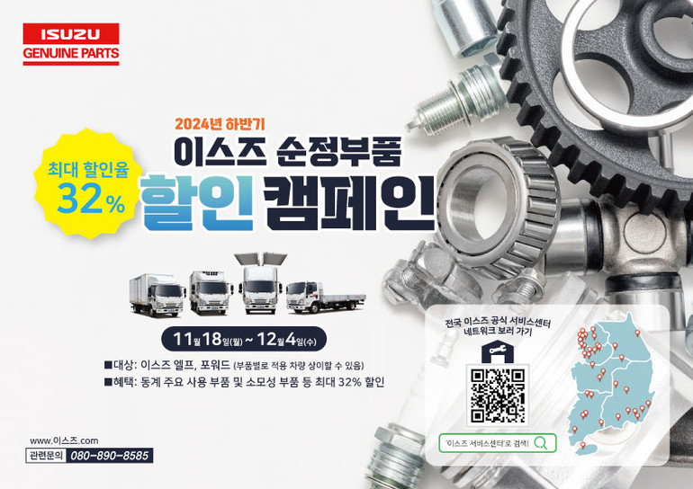 세계적인 상용차 제조업체인 이스즈(ISUZU)의 국내 공식 판매사인 ㈜큐로모터스가 '2024 하반기 이스즈 순정부품 할인 캠페인'을 실시한다. 이번 캠페인은 고객 서비스 만족도 제고와 차량 관리 지원을 위해 마련됐다.