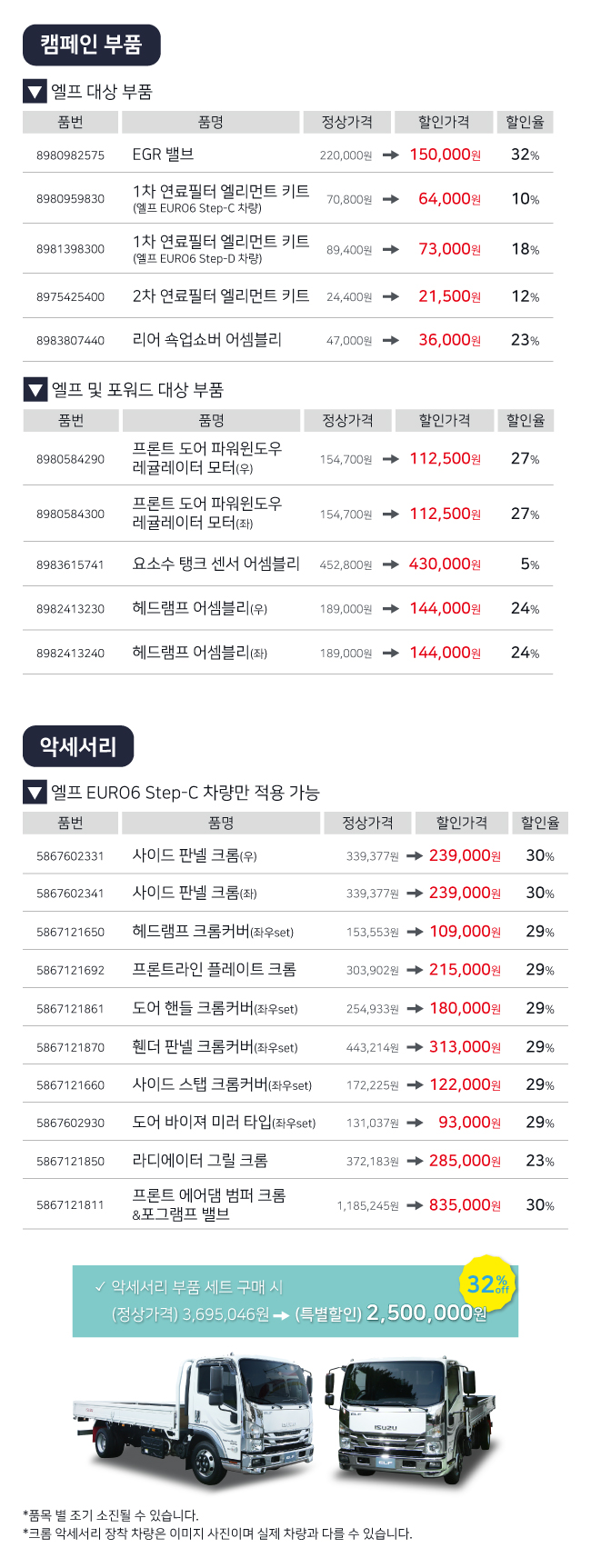 이번 캠페인의 핵심은 파격적인 순정부품 할인 혜택이다. EGR(배기가스 재순환장치) 밸브 등 주요 부품은 최대 30%의 할인율이 적용된다. 특히 배기 가스 기준인 유로6(EURO6) 스텝 C를 적용한 엘프 트럭 고객을 위해서는 크롬 악세사리 개별 부품 최대 30% 할인과 함께, 세트 구매 시 32%의 특별 할인 혜택도 제공된다. 정상가 370만원 상당의 악세사리 세트가 250만원대로 구매 가능한 파격적인 혜택이다.