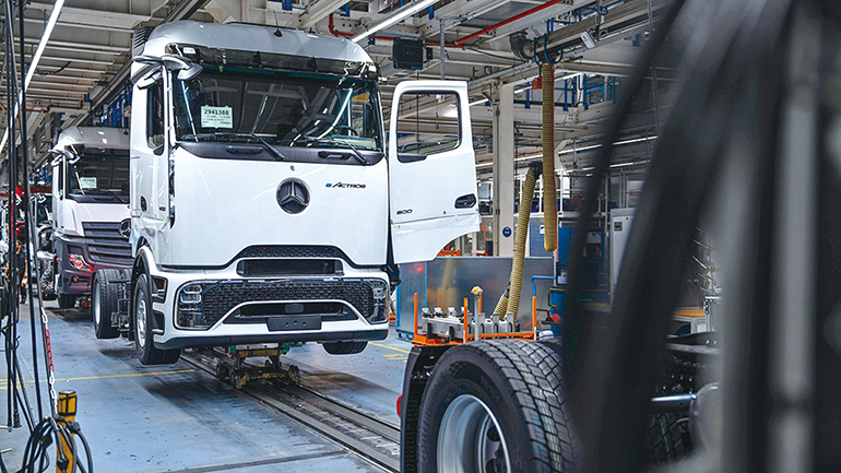 eActros 600은 기존 디젤트럭과 동일한 조립 라인에서 생산되며, 주위 3개 부품 공장에서 전기트럭을 활용해 부품을 공급받고 있다.