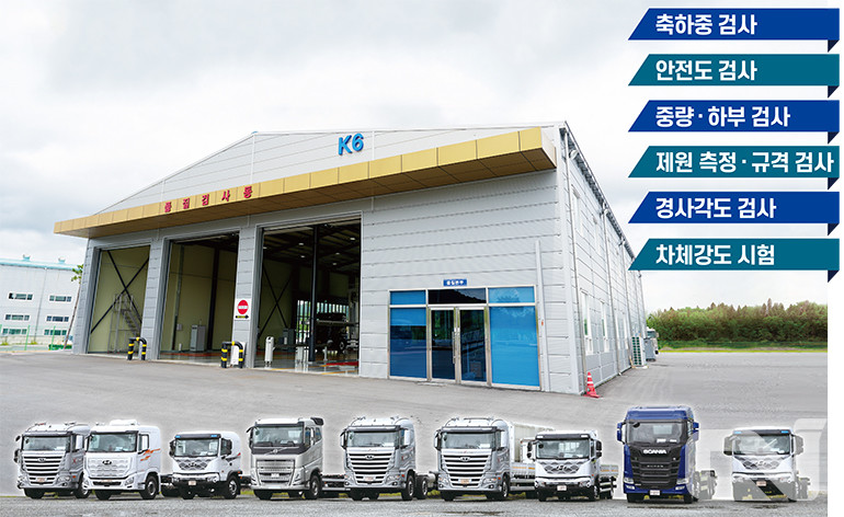 품질 검사동에는 ▲축하중 검사 ▲종합 검사 ▲중량 및 하부 검사 ▲제원 측정 및 규격 검사 ▲경사각도 검사 ▲차체강도 시험 등 총 6개 검사 시설과 구역으로 나뉘어 있다. '고객이 안심하고 쓸 수 있는 차량 생산'을 목표로 하는 ㈜한국쓰리축 본사를 살펴보았다.
