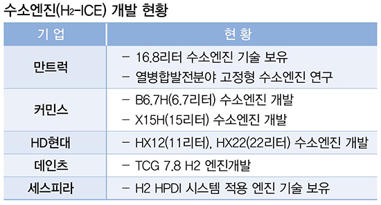 엔진개발에 있어 이미 선도적으로 리드하고 있는 독일 만트럭버스는 2021년부터 트럭 프로토타입을 보유해 오고 있으며, 모듈식 디젤엔진 시스템을 기반으로 500마력 이상, 2,500Nm 토크의 16.8리터 수소엔진 기술을 보유하고 있다.
