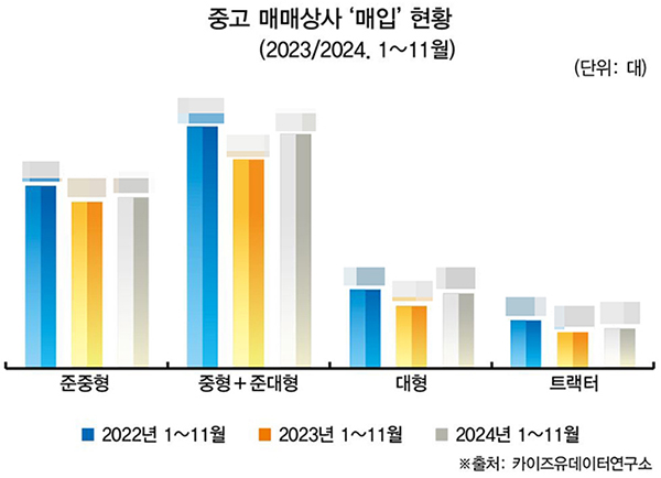 한편 중고트럭 매매단지들의 매입은 오히려 크게 늘었다. 지난해 1~11월 매매단지의 매입량은 총 1만 9,828대로 전년(1만 8,056대) 대비 9.8% 증가했다. 차급별로는 대형 카고(20.4%↑)와 중형·준대형 카고(12.2%↑)의 매입이 큰 폭으로 늘었다.