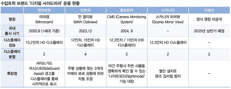 세계 최초로 디지털 사이드미러를 개발하고 국내 트럭 업계 최초로 적용한 브랜드는 메르세데스-벤츠트럭이다. 다임러트럭코리아는 2020년 ‘악트로스 MP5’를 통해 ‘미러캠(MirrorCam)’이라 칭한 디지털 사이드미러를 국내 최초로 선보여 현재까지 기본 사양으로 적용하고 있다.
