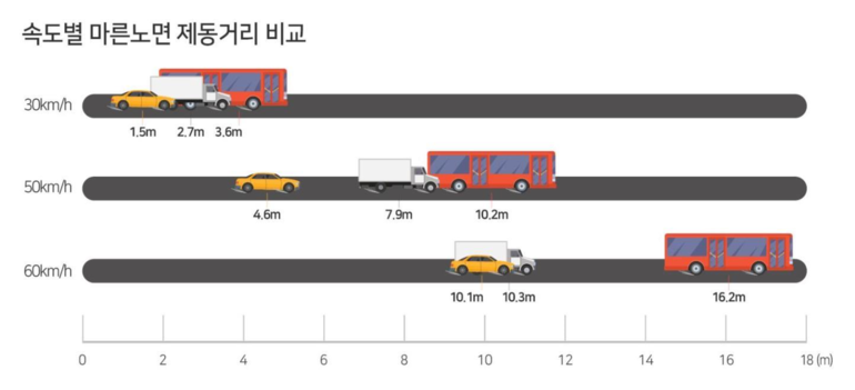 차체의 중량이 큰 차종일수록 속도와 제동거리 증가