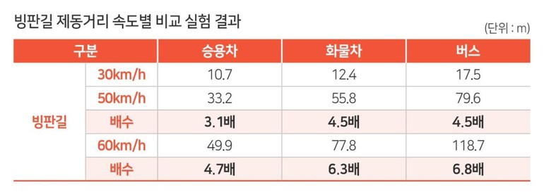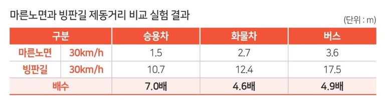 아울러 시속 50㎞ 조건에서도 마른노면과 빙판길 제동거리를 비교해서 실험한 결과, 화물차, 버스의 빙판길 제동거리가 시속 30km와 비교했을 때 각각 4.5배 증가한 것으로 확인됐으며, 시속 60㎞에서는 화물차, 버스의 빙판길 제동거리가 각각 6.3배, 6.8배 증가한 것으로 분석됐다. 차체의 중량이 큰 차종일수록 속도 증가에 따른 제동거리도 크게 증가하는 것이다.