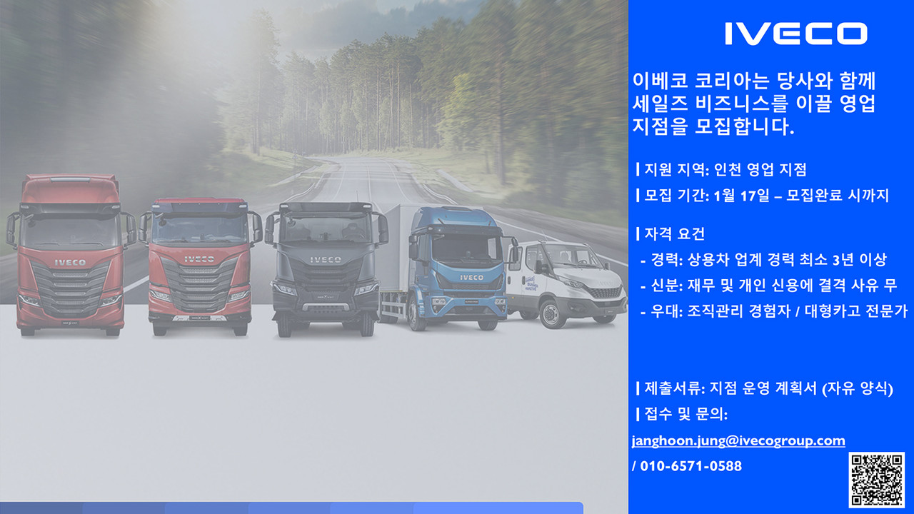 이탈리아 상용차 브랜드 이베코(IVECO)의 한국지사 이베코코리아가 고객 서비스 강화를 위해 인천 지역의 신규 영업 지점을 공개 모집한다.