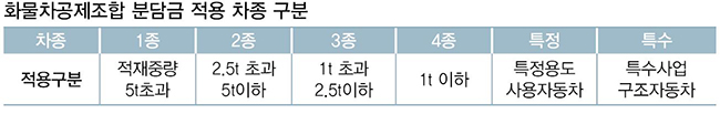 공제조합 보험료는 톤수 별로 금액이 다르고, 대인이나 대물 등의 가입 한도와 적재물 가입 한도, 이외 특약이나 담보 사항 등에 따라서도 달라진다. 공제계약 분담금은 1~4종, 특정용도, 특수차량으로 구분되며 사고원인에 따라 10~30%까지 할증되는 일반 손해보험과 달리 사고원인별 할증이 없다. 특별 할증의 경우 공제조합은 5개 그룹 14개 항목에 대해 3년 간 적용된다.