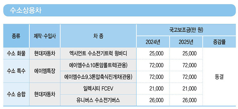 관련기사 2025년 전기·수소차 보조금 ‘주행성능’에 차등 2025 전기승합차 국고보조금 지원 현황 2025 전기화물차 국고보조금 지원 현황 전기차 국고보조금, 중형 버스 늘고 대형 버스·화물차는 줄었다 더보기 접기 저작권자 © 상용차신문 무단전재 및 재배포 금지 키워드 Tags #수소상용차 #수소화물차 #수소특수차 #수소버스 #수소차보조금 상용차신문 news@cvinfo.com 다른기사 보기 SNS 기사보내기 페이스북(으)로 기사보내기 트위터(으)로 기사보내기 카카오스토리(으)로 기사보내기 URL복사(으)로 기사보내기 이메일(으)로 기사보내기 다른 공유 찾기 기사스크랩하기 당신만 안 본 뉴스 타타대우-삼척시, 수소엔진 실증 생태계 구축 위한 MOU 체결 벤츠트럭 'e악트로스 600', 충돌 시험서 차량 안전성 입증 기아 4조 원 투자, PBV 전용 'EVO Plant' 화성에 조성...연 25만 대 생산 목표 친환경 상용차 연료비, 내연기관 추월하나? 현대차그룹 수소 브랜드 HTWO, 중국 광저우에 수소버스 공급 만트럭버스코리아, '바디빌더 세미나 2025'로 특장 업계 협력 강화 기아, 평택에 PBV 특화 거점 'PBV 익스피리언스 센터' 개소 타타대우-삼척시, 수소엔진 실증 생태계 구축 위한 MOU 체결 댓글삭제 삭제한 댓글은 다시 복구할 수 없습니다. 그래도 삭제하시겠습니까? 비밀번호 닫기 기사 댓글 0 댓글 접기 로그인 후 이용 가능합니다. 댓글 내용입력 비회원 로그인 이름 비밀번호 댓글 내용입력 댓글쓰기 계정을 선택하시면 로그인·계정인증을 통해 댓글을 남기실 수 있습니다. 회원 로그인 비회원 글쓰기 이름 비밀번호 자동등록방지 로그인 옵션 창닫기 주요기사 만트럭버스코리아, 탱크로리·BCC 전용 '뉴 MAN TGX 4800' 출시 서울시 보유 경유청소차 2,800대 중 절반이 1~5톤급 한성특장, 특장업계 최초 ‘트럭·특장 전손보험’ 첫 적용...3천만원 재구매 지원 만트럭버스코리아, '바디빌더 세미나 2025'로 특장 업계 협력 강화 공신력 데이터 기반 ‘중고 트럭과 특장차 시세’ 제공한다 10월 트럭 시장, 전년 동월 대비 25.5% 감소