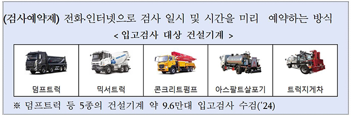 국토교통부(이하 국토부)가 건설기계(덤프트럭, 믹서트럭, 콘크리트펌프, 아스팔트살포차량, 트럭지게차 등)의 검사 대기시간을 줄이기 위해 오는 10일부터 전국 18개 건설기계 검사소에서 예약제를 전면 시행한다고 밝혔다.