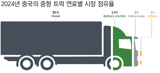 전년도에는 70%에 달했던 디젤 트럭의 비중이 다소 줄어든 것이다. 뒤이어 천연가스를 연료로 하는 트럭이 29%의 점유율로 두 번째를 차지했으며, 전기트럭은 13%를 기록하며 세 번째로 높은 판매량을 보였다.