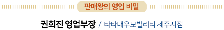 타타대우모빌리티에 입사한 지 10년. 권회진 타타대우모빌리티 제주지점 영업부장은 현재(4월 10일 기준)까지 총 700대 이상의 중대형 트럭을 판매하며, 타타대우의 전체 여성 영업사원 중에서 ‘판매량 1위’라는 실적과 명예를 동시에 얻었다. 남녀 구분없이 전체 영업사원 중에서도 판매 2위를 기록할 만큼, 괄목할 영업 성과를 낸 그녀는 지금도 제주 방방곡곡을 누비며 영업 현장을 뛰고 있다.