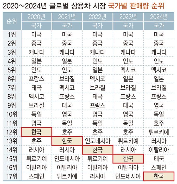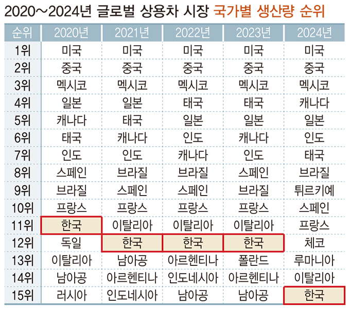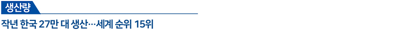 한국은 같은 해 27만 7,925대를 생산해 세계 15위, 19만 2,978대를 판매해 17위에 올랐다. 판매량은 2020년 이후 꾸준히 감소하면서, 지난해에는 5년 만에 20만 대를 밑돌며 판매 순위도 전년보다 두 단계 하락했다.