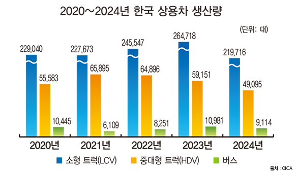 반면 한국은 모든 차종에서 생산량이 줄었다. 중대형 트럭은 4만 9,095대로 전년(5만 9,151대)보다 17.0%, 소형 트럭은 21만 9,716대로 16.9%, 버스는 9,114대로 17.0% 각각 감소했다.