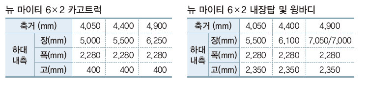 세부적인 사양에 있어서는 우선 축거(축간거리)의 경우 뉴 마이티 3.5톤 극초장축을 기반으로 카고트럭, 내장탑, 윙바디 모두 4,050mm, 4,400mm, 4,900mm 등으로 구분했다. 축거의 다양성을 통해 운송 효율성과 안정성을 동시에 기했다. 이와 함께 화물 크기, 파렛트, 특장차 개조 여부 등을 감안한 하대 내측 치수를 정했다.