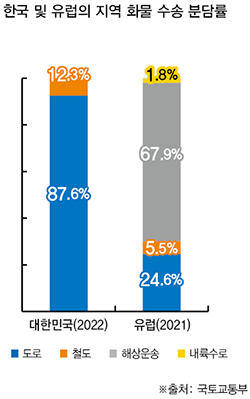 이러한 도로 의존 구조는 EU(유럽연합)와 비교할 때 더욱 극명하게 드러난다. EU 통계국(Eurostat, 2021)에 따르면, EU의 화물 운송량의 3분의 2(67.9%)가 해상 운송이며, 도로 운송은 전체의 24.6%에 불과하다.