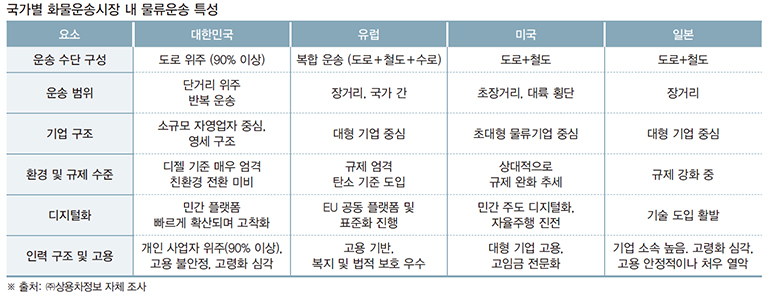 이러한 시장 구조는 유럽과 미국의 기업형 운송사 중심 체계와 극명하게 대비된다. 이들 국가에서는 대형 운송 기업이 시장을 주도하며 운송 품질과 서비스 표준화가 정착되어 있고, 화물차 운전자의 고용 안정성과 근로 조건이 보장된다.