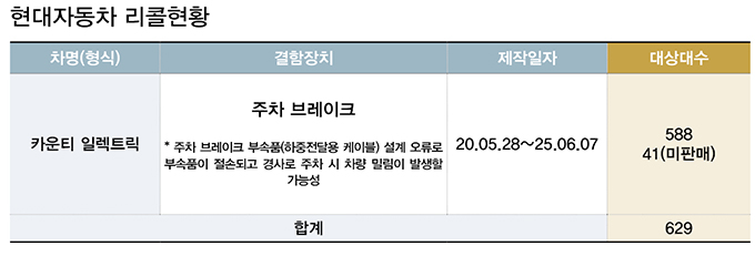 현대차에서 제작·판매한 카운티 일렉트릭 629대는 주차 브레이크 부속품(하중전달용 케이블) 설계 오류로 부속품이 절손 되고 경사로 주차 시 차량 밀림이 발생할 가능성이 있어, 이에 자발적 시정조치(리콜)에 들어간다.