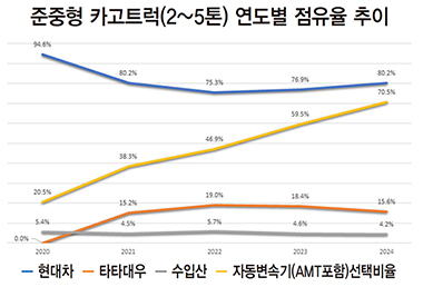 실제로 옵션 비용이 크게 늘어남에도 불구하고 준중형 카고의 자동변속기(AMT 포함) 선택 비율은 2020년 20.5%에서 2024년 70.5%로 5년 만에 3배 이상 급증했다.
