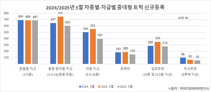 구체적으로 지난 5월 한 달 동안 2톤 이상 준중형급 이상 카고트럭(특장 포함) 및 트랙터 등 운송용 트럭, 15톤 및 25.5톤 이상 덤프트럭 및 믹서트럭(6㎥) 등 건설용 트럭은 2,168대가 판매됐다. 이는 전년 동월(2,410대) 대비 10.0% 감소했으며, 전월(2,591대)보다는 16.3% 줄어든 수치다.