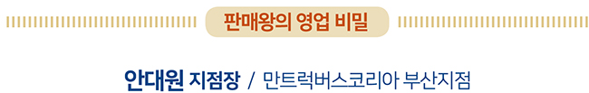 만트럭버스코리아에 입사한 지 햇수로 7년 차, 안대원 만트럭버스 부산지점 지점장은 연 평균 40대 이상의 트럭을 판매하며, 지난 5년간 누적 300여 대(7월 22일 기준)를 판매하며, 만트럭버스코리아에서 5년 연속 판매 1위를 이어오고 있다.