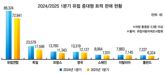 중형트럭(3.5톤 초과~16톤 미만)도 비슷한 상황이다. 유럽연합 내 중형 트럭 판매량은 1만 2,048대로, 전년 동기(1만 3,776대) 대비 12.6% 줄었다. 독일은 19.7%, 프랑스는 4.2%, 영국은 4.9% 감소해 대형트럭보다는 낙폭이 작지만, 전반적인 하락세가 이어졌다.