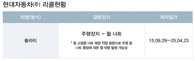현대차에서 제작·판매한 쏠라티 3,278대는 휠 고정용 너트 체결 작업 불량으로, 주행 중 너트 풀림에 의한 휠 이탈 가능성이 있어, 이에 7월 31일부터 자발적 시정조치(리콜)에 들어간다. 이번 결함시정과 관련하여 해당 제작사에서는 자동차 소유주에게 우편 및 휴대전화 문자로 시정 방법을 알릴 예정이다.