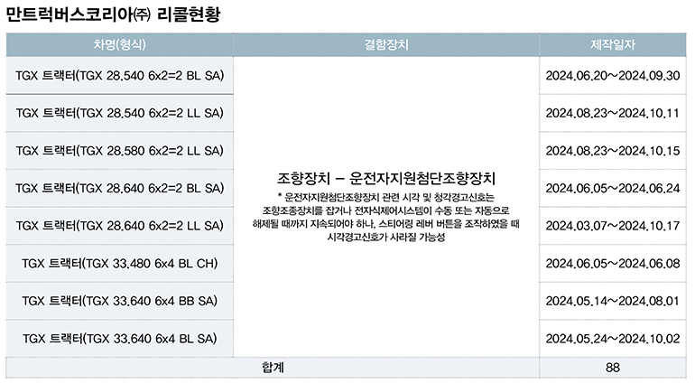 범한자동차㈜에서 수입·판매한 TGX 트랙터 88대는 소프트웨어 설계오류로 인해 운전자지원첨단조향장치 관련 시각 및 청각경고신호는 조향조종장치를 잡거나 전자식제어시스템이 수동 또는 자동으로 해제될 때까지 지속되어야 하나, 스티어링 레버 버튼을 조작하였을 때 시각경고신호가 사라질 수 있는 가능성이 확인됨에 따라 8월 11일부터 자발적 시정조치(리콜)에 들어간다.