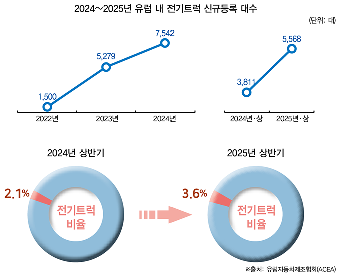 유럽자동차제조협회(ACEA)에 따르면, 2024년 유럽 내 판매대수(신규 등록 기준)는 총 7,542대로 기록됐다. 이는 전년도인 2023년 5,279대보다 42.9% 증가한 실적이다. 중대형 전기트럭 보급이 본격 개시된 시점인 2022년 1,500대와 비교하면 단 3년여 만에 시장 규모가 5배 이상 늘어난 셈이다.