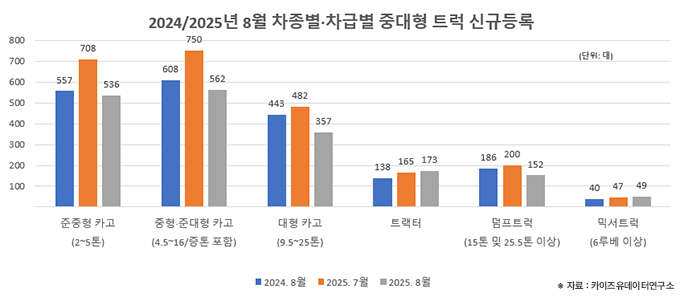 카이즈유데이터연구소 통계에 따르면, 준중형급 트럭 시장 판매(신차 신규등록 기준)는 1,829대로, 전년 동월(1,972대) 대비 7.3%, 전월(2,352대)보다 22.2% 감소했다. 이에 따라 1~8월 누적 등록 대수는 1만 7,315대로, 전년 동기(1만 9,388대) 대비 10.6% 줄었다.