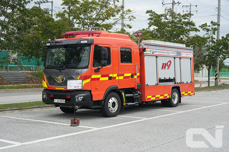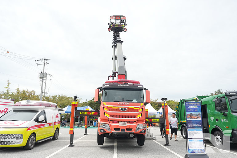 소방 특장차 전문업체 대진정공은 긴급 출동 시 발생하는 급가속·급제동으로부터 소방관의 안전을 지키기 위해 6자유도 기반 지능형 안전벨트 제어 시스템을 적용한 신형 소방차를 공개했다. 이와 함께 고효율 복합터빈과 고압 제트 기술을 적용해 미세먼지와 분진을 신속히 제거할 수 있는 도로오염제거차량도 함께 전시해 눈길을 끌었다.
