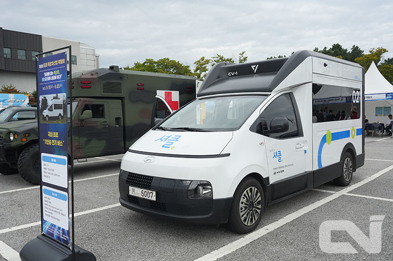 ㈜엠티알은 현대자동차의 PBV(목적기반차량) 차량인 ‘ST1’을 기반으로 제작된 11인승 전기 승합 모델 ‘CV1’을 선보였다.