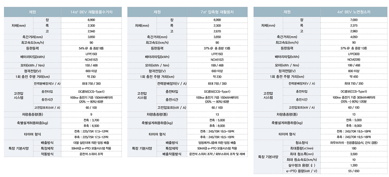 다음 타타대우는 준중형 전기트럭 '기쎈(GIXEN)' 모델을 기반으로 한 재활용품수거차, 압축형 재활용차, 노면청소차 3종을 시연했다. 재활용품수거차는 50kW급 E-PTO 모듈과 더블 실린더 덤핑 시스템을 탑재했으며, 노면청소차는 습식·건식 시스템으로 도로재비산먼지를 방지하는 기능을 갖췄다. 배터리는 중국 BYD의 LFP와 삼성SDI의 NCM 두 종류를 사용하며, 배터리 탑재 옵션에 따라 1회 충전으로 최대 485km까지 주행 가능하다.