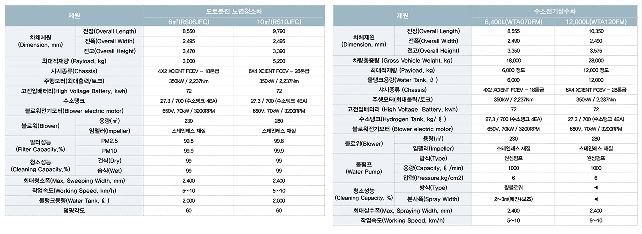 신정개발특장차는 현대자동차 엑시언트 수소연료전지트럭(FCEV) 기반의 도로분진노면청소차와 살수차를 시연했다. 2020년부터 국가 연구개발 과제로 개발을 시작해 2023년 완료, 2024년 우수제품으로 등록됐다. 관계자는 수소차의 경우 1회 충전으로 1~2일간 사용 가능하며,기존 CNG차량보다 연비가 우수하다고 설명했다.