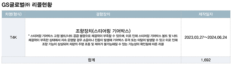 GS글로벌㈜에서 수입·판매한 T4K 1,692대는 스티어링 기어박스 고정 볼트/너트의 오사양 공급으로 인해 체결력이 부족할 수 있으며, 기어박스 유격 또는 이탈 발생으로 조향 기능이 상실될 가능성에 따라 10월 29일부터 자발적 시정조치(리콜)에 들어간다.