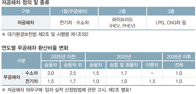 자동차 6대 이상을 보유한 공공기관은 대기환경보전법 개정에 따라 2026년 1월 1일부터 차량 구매 시 저공해차를 의무 구매해야 한다. 참고로 저공해차는 1종(전기·수소), 2종(하이브리드), 3종(LPG·CNG)으로 나뉜다.