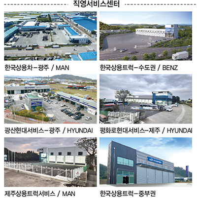 한국상용차트럭은 일반 정비업체에 의존해오던 기존 가변축 시장의 서비스 품질 한계를 극복하고 ‘미래의 신제품 개발과 전문 서비스 센터 접목’이란 대명제하에 현재까지 광주광역시 평동산단 내 본사 겸 서비스센터 외에 ▲한국상용차 만트럭 광주서비스센터 ▲광주 광산현대서비스센터 ▲한국상용트럭 중부권역 서비스센터 ▲한국상용트럭 수도권역 벤츠트럭 오산 서비스센터 ▲제주 평화로현대서비스센터 ▲제주 만트럭 제주서비스센터 등 7대 직영서비스센터를 구축했다. 전국 주요 거점에 국내외의 상용차 브랜드와 연계한 서비스 딜러망을 구축·운영 중인 특장장업체는 한국상용트럭이 유일하다.