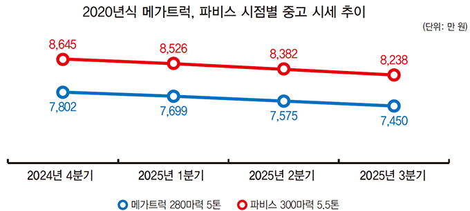 분기별로 보면 메가트럭은 지난해 4분기 대비 올해 1분기 103만 원, 1분기 대비 2분기 124만 원, 2분기 대비 3분기 125만 원씩 내려갔다. 파비스는 같은 기간 각각 119만 원, 144만 원, 144만 원씩 하락했다. 두 차종 모두 분기당 평균 100만 원 이상씩 시세가 떨어지는 패턴이다.