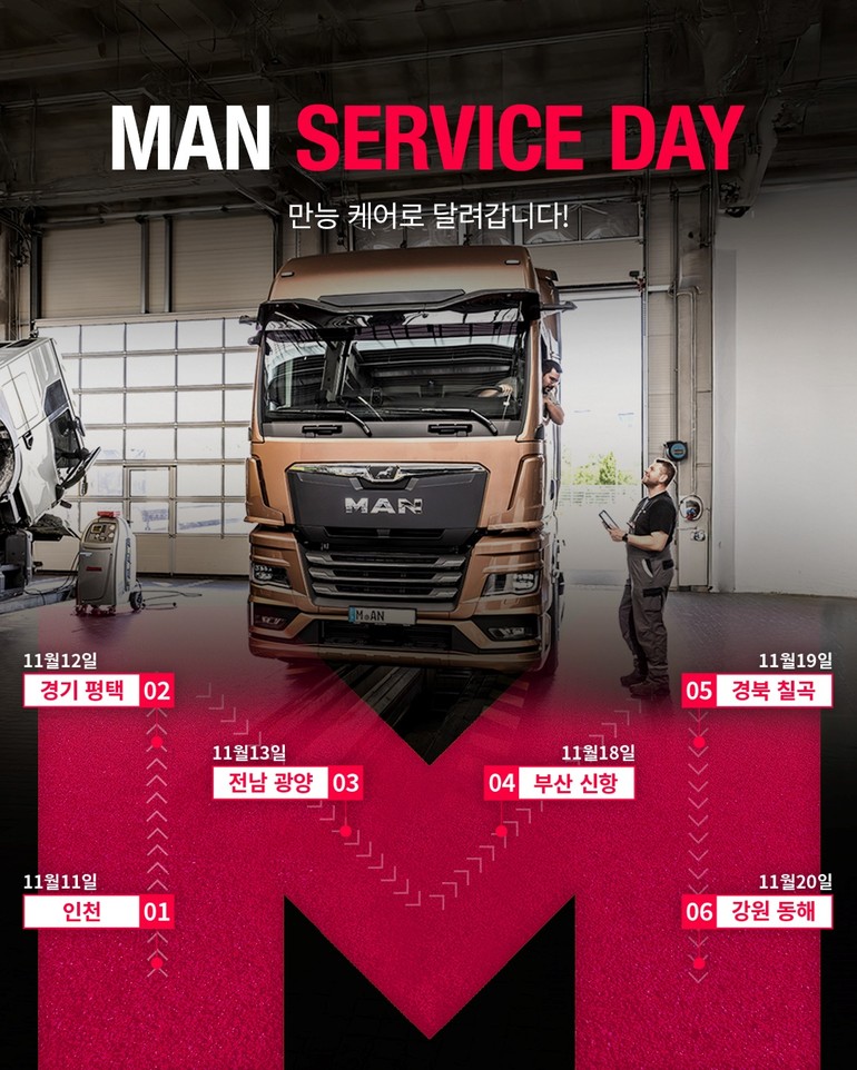 만트럭버스그룹(MAN Truck & Bus SE)의 한국법인 만트럭버스코리아(이하 만트럭)가 오는 11일부터 20일까지 'MAN 서비스데이' 무상 점검 행사를 개최한다고 밝혔다.