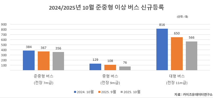 카이즈유데이터연구소 통계에 따르면, 지난달 준중형급 이상 버스 시장 판매(신차 신규등록 기준)는 998대로, 전년 동월(1,329대) 대비 24.9%. 전월(1,125대)보다는 11.3% 줄어들었다. 이에 따라, 올해 1월부터 10월까지 누적 등록 대수는 9,103대로, 전년 동기(9,878대)보다 7.8% 감소했다.