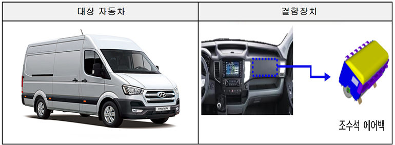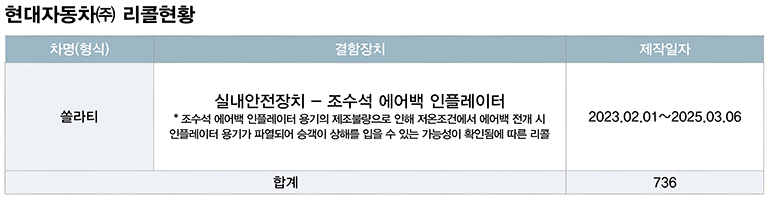 현대차에서 제작·판매한 쏠라티 736대는 조수석 에어백 인플레이터 용기의 제조 불량으로, 저온조건에서 에어백 전개 시 인플레이터 용기가 파열되어 승객이 상해를 입을 수 있는 가능성이 확인됨에 따라 11월 14일부터 자발적 시정조치(리콜)에 들어간다. 이번 결함시정과 관련하여 해당 제작사에서는 자동차 소유주에게 우편 및 휴대전화 문자로 시정 방법을 알릴 예정이다.